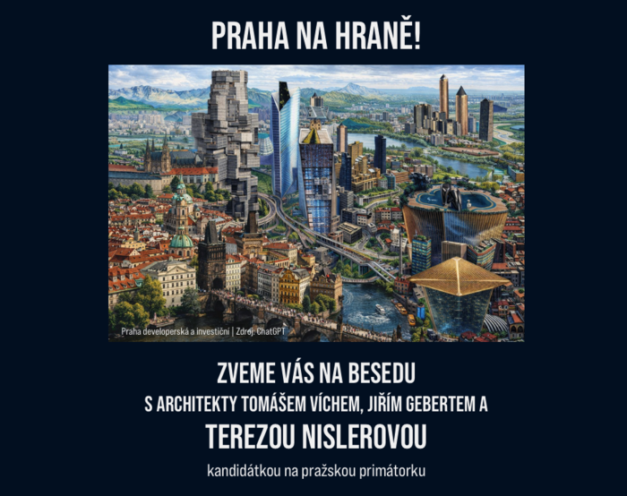 Budeme se věnovat horkému tématu budoucnosti bydlení v Praze. Zveme Vás na besedu s architekty Tomášem Víchem, Jiřím Gebertem a hostem Terezou Nislerovou, kandidátkou na pražskou primátorku. V programu je úvodní krátká prezentace, panelová debata a volná diskuse k tématu s dotazy z publika.